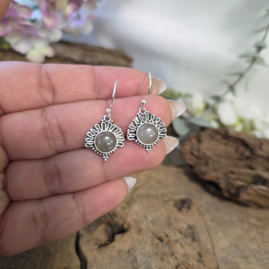🦚 Zilveren Pauw Oorbellen met Grijze Maansteen – Elegantie met een Spirituele Touch