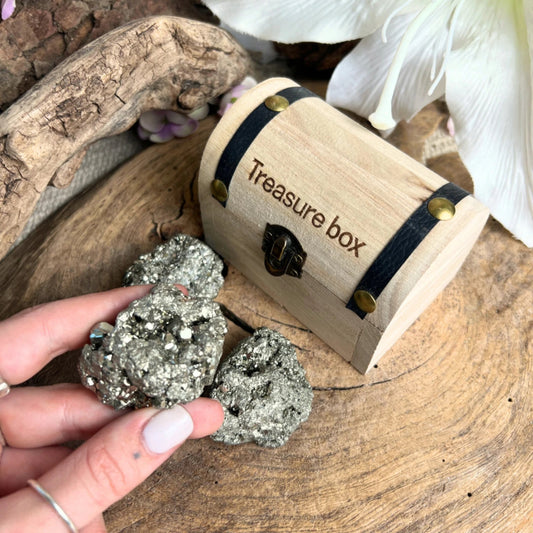πͺ Schatkistje met Ruwe Pyriet β Daadkracht en glans in een houten omhulsel