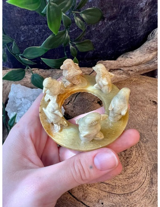 Speksteen Pinguïns op Ring - Uniek Beeldje van 8 cm